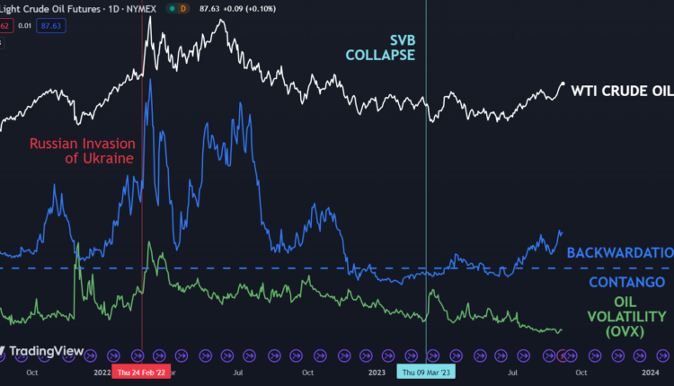 WTI CRUDE OIL, BACKWARDATION AND VOLATILITY (OVX)