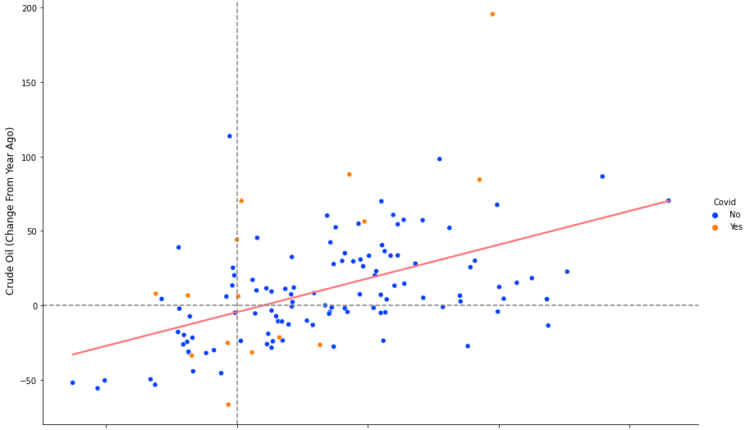 As such, you would expect Chinese oil demand to be a key driver of prices. Below is the historical relationship between overall Chinese imports and the price of crude oil since 1992. The data is quarterly, and I am analyzing changes from a year ago. Generally, it does appear to be the case that as Chinese imports rise, the price of crude oil seems to follow and vice versa (orange dots are after Covid).
