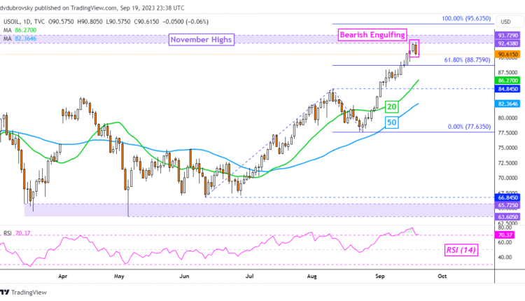 WTI crude oil prices might be showing early signs of topping that might be worth paying attention to from a technical standpoint. On the daily chart below, a Bearish Engulfing has emerged. Downside confirmation is lacking at this stage, however. Further downside from here could underscore the candlestick pattern.