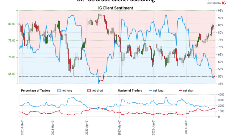 Crude oil prices have rallied over 17 percent since bottoming in the middle of June. So far this month, WTI is up over 13%. If gains are sustained, this would mark the best 20-day period for oil since January 2022. In response, retail traders have continued to increase downside exposure. This can be seen by looking at IG Client Sentiment (IGCS), which tends to function as a contrarian indicator.