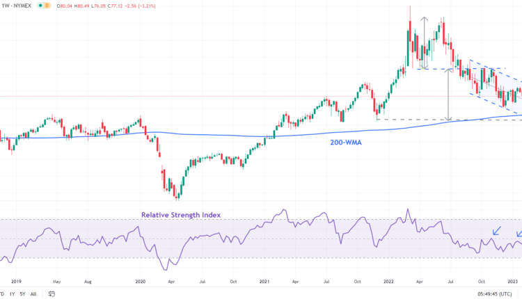 The break in August triggered a double top pattern (the 2022 highs), pointing to a drop toward the 200-week moving average (now at about 66.00), the price objective of the pattern. Since then, crude oil has been guided lower in a slightly downward-sloping channel, characterized by lower-highs-lower-lows.