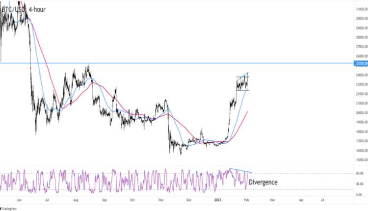 BTC/USD, which was consolidating in a 22,400 – 23,800 range, spiked higher and briefly traded above the 24,000 psychological handle.