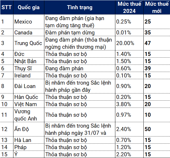 Mức thuế quan của Mỹ đối với 15 đối tác thương mại hàng đầu