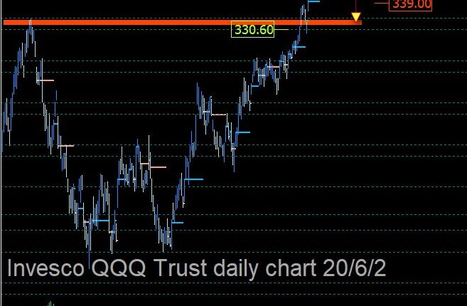 The QQQ ETF's price has exhibited prolonged overbought conditions, as indicated by the Relative Strength Index (RSI), suggesting the potential for a pullback. On the daily chart, we observe two failed attempts by the price to surpass the 371 level, signifying a notable resistance zone.