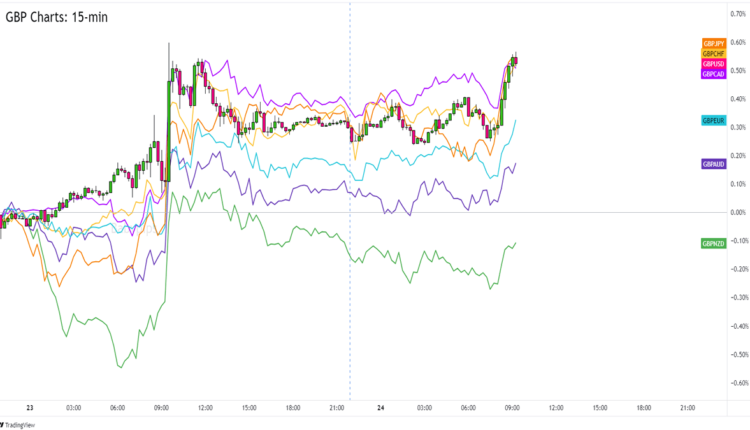 GBP is seeing the most gains against JPY, CHF, and EUR and is up the least against NZD, AUD, and CAD.