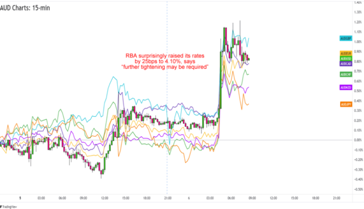 The hawkish rate hike (the RBA also said that further rate hike may be required) sent AUD higher across the board.