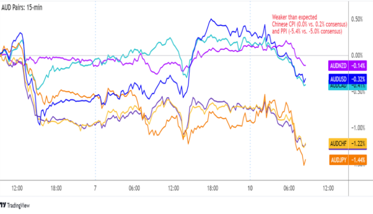 After a lot of consolidation and a bit of a rally versus the dollar, AUD pairs started the week on shaky footing when China printed weaker than expected inflation data.