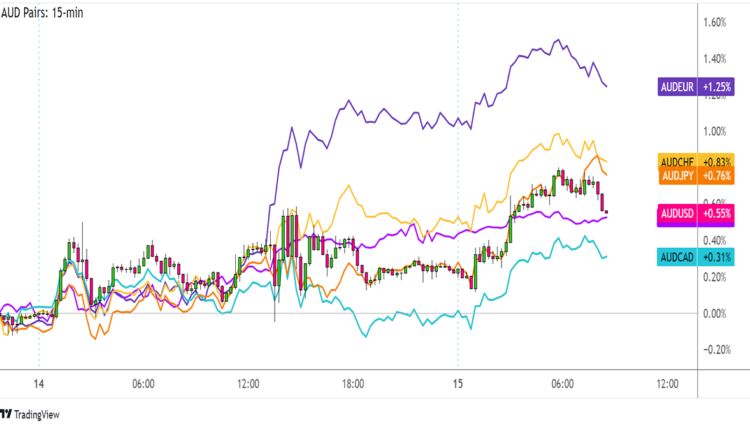 Overlay of AUD Pairs: 15-min Charts