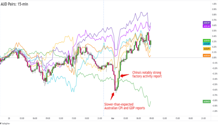 Then, China’s better-than-expected official and private sector factory activity numbers turned things around for AUD and other risk assets. The notable jumps in output and new orders highlighted the increased global demand post-COVID and fueled the start-of-month risk-taking.