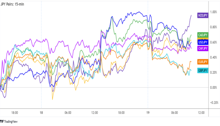Risk-taking dragged the safe-haven yen south against its forex peers for the most part of the U.S. session, before the Japanese currency managed to regain ground on upbeat Japanese inflation data.