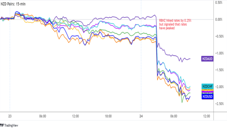 RBNZ hiked interest rates by 0.25% as expected from 5.25% to 5.50% but signaled possibility of pausing soon, as policymakers had a split decision to tighten
