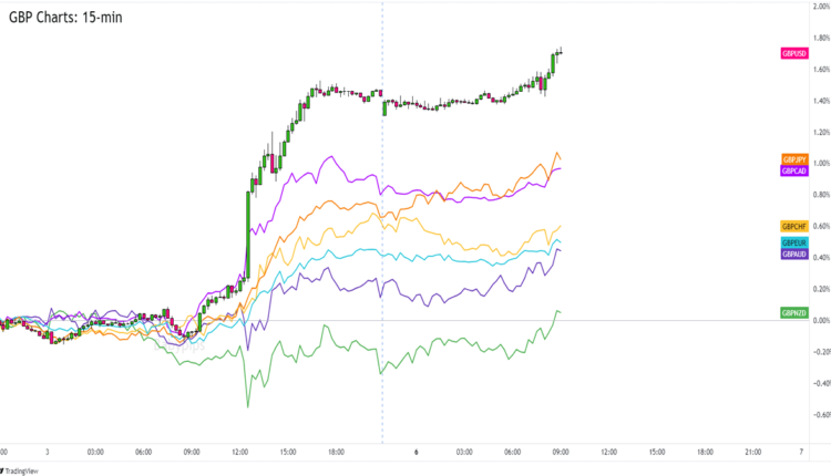 As mentioned above, a round of risk-taking helped GBP gain pips against its major counterparts.