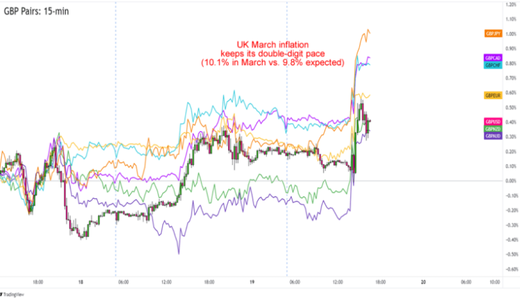 U.K.’s inflation surprises to the upside, up by 10.1% y/y in March vs. 9.8% expected and 10.4% in February, as households continue to deal with high food and energy bills.