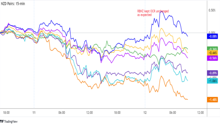RBNZ kept OCR unchanged at 5.50% as expected, citing that “level of interest rates are constraining spending and inflation pressure as anticipated and required”