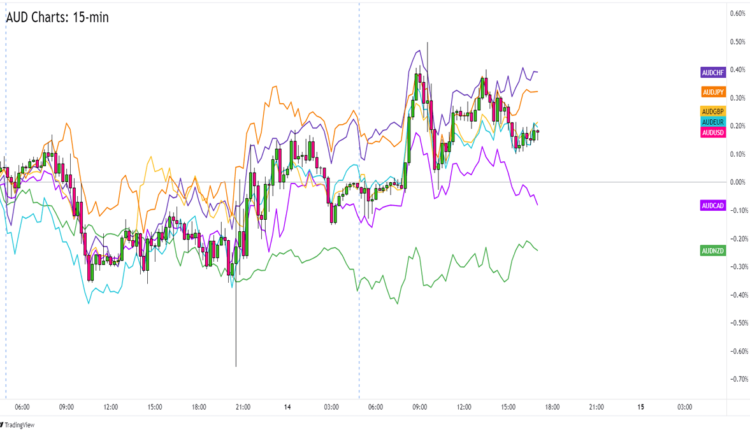 Overlay of AUD Pairs 15-min Chart