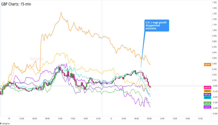 The U.K.’s weak jobs data might make it harder for the Bank of England (BOE) to sound hawkish on Thursday and it showed in GBP’s price action.