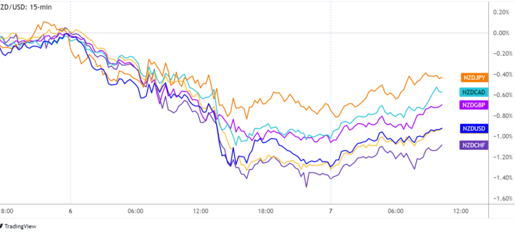 Risk-off flows weighed on the Kiwi, even as most markets were closed on a holiday.