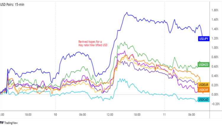 The U.S. dollar enjoyed a strong boost from revived hopes of a 0.25% Fed rate hike in May, but eventually returned these gains when risk appetite picked up during the Asian session.