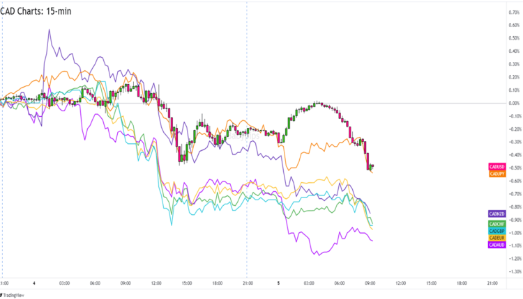 So far, CAD has registered its biggest losses against AUD, NZD, and JPY and is seeing the least intraday losses against GBP, CHF, and USD.