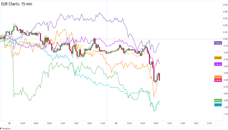 EUR is trading the lowest against USD and CHF while experiencing the least losses against GBP and NZD.
