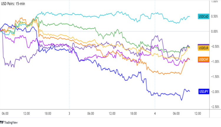 The Greenback slid lower across the board, accelerating its decline against the Japanese yen as risk-off flows remained in play.