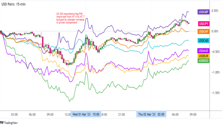 US ISM manufacturing PMI improved from 47.4 to 47.7 in February, short of the estimated 47.9 reading but still indicative of slower contraction in the industry