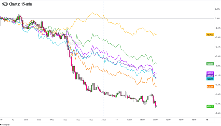As of writing, NZD is down the most against GBP and CHF and has lost the least pips against USD and JPY.