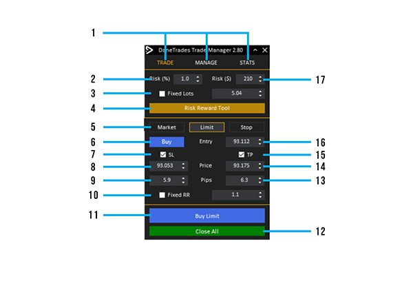 - Max daily loss in % of the current balance. When hit all trades will be closed and you will not be able to enter any more trades using the panel