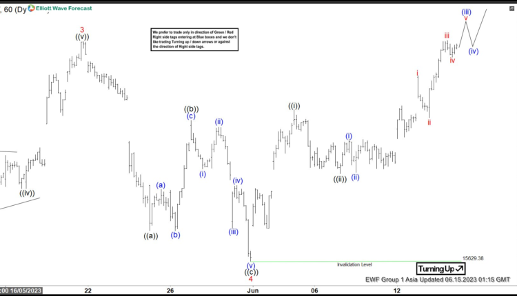 Internal subdivision of wave 5 is unfolding as a 5 waves impulse Elliott Wave structure. Up from wave 4, wave ((i)) ended at 16114.84 and pullback in wave ((ii)) ended at 15909.85. Index then resumes higher again in wave ((iii)). Up from wave ((ii)), wave (i) ended at 16020.28 and wave (ii) ended at 15913.95. Expect the Index to extend higher 1 more leg to complete wave (iii), then it should pullback in wave (iv) before it resumes higher again. Near term, as far as pivot at 15629.38 low stays intact, expect dips to find support in 3, 7, or 11 swing for further upside.