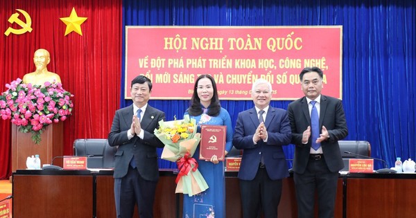 Lãnh đạo tỉnh Bình Dương trao Quyết định của Ban Bí thư Trung ương Đảng cho bà Nguyễn Thị Tuyết Thanh. Ảnh: BD