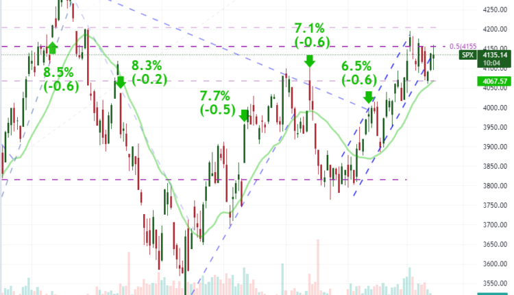 Chart of S&P 500 with 20-Day SMA, Volume and Day/Change in US CPI YoY (Daily)