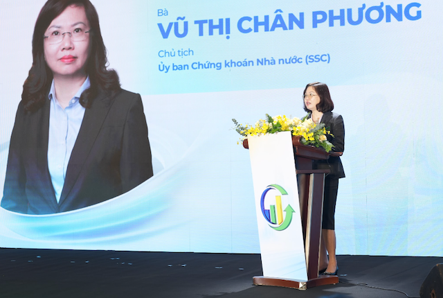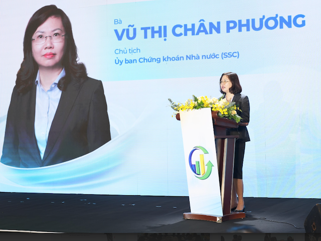 Bà Vũ Thị Chân Phương – Chủ tịch Ủy ban Chứng khoán Nhà nước phát biểu tại AF8. Ảnh: BTC