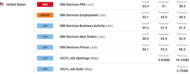 US ISM services PMI numbers (see economic calendar below) reached their highest level since February this year reflecting a resilient US economy – considering the US is primarily services driven. The non-manufacturing sector remains in expansionary territory with business activity, new orders and employment all growing. The tight labor market was reiterated through the ADP employment change release earlier that almost doubled estimates coming in at 497K. Using this as a precursor to tomorrow’s Non-Farm Payroll (NFP), the current hawkish bias from the Fed may be supplemented.
