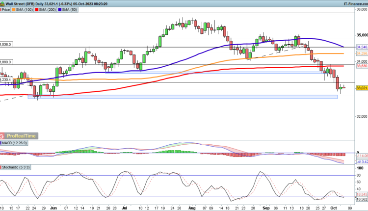 The index rallied off its lows yesterday, after heavy losses on Tuesday and Wednesday.Bulls now need to push the price back on above 33,230 to indicate that a low might be in. This might then allow the index to push on toward the 200-day simple moving average (SMA).