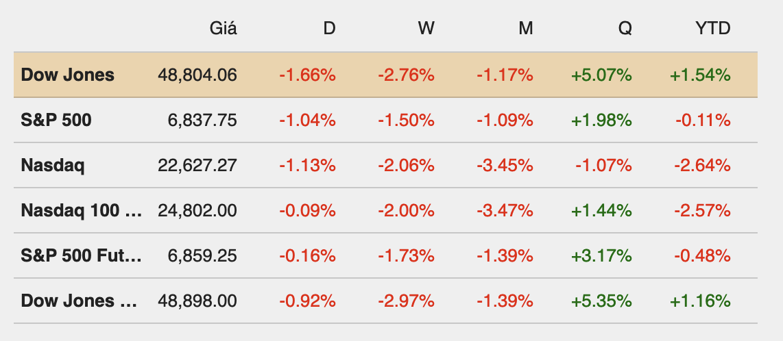 Chỉ số Dow Jones Industrial Average giảm 821.91 điểm, tương đương 1.66%, xuống 48,804.06 điểm. Nasdaq Composite mất 1.13% còn 22,627.27 điểm, trong khi S&P 500 giảm 1.04% xuống 6,837.75 điểm, khiến chỉ số này quay trở lại trạng thái giảm trong năm 2026.
