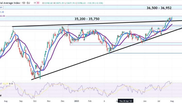 - DJIA is overbought on daily RSI, trading near the 35,750 resistance level.