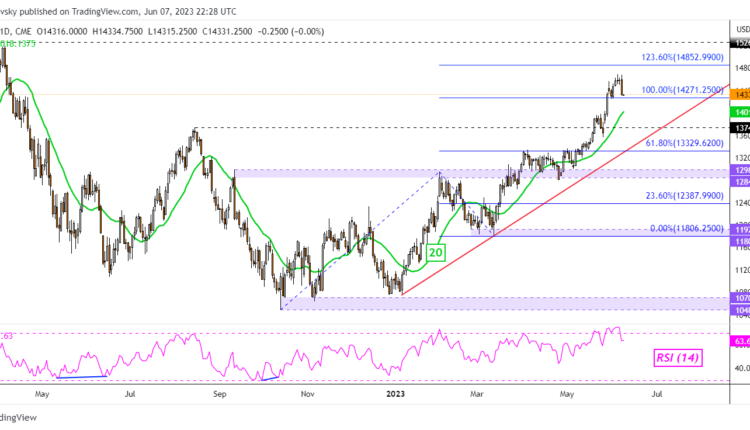 On the daily chart, the Nasdaq 100 has fallen back to the 100% Fibonacci extension level at 14271. The index remains in a clear uptrend, with the 20-day Simple Moving Average and January trendline guiding prices higher. Reversing the uptrend would thus require meaningful follow-through lower from here. Key resistance is the 123.6% level at 14852 before 15768 comes into focus.