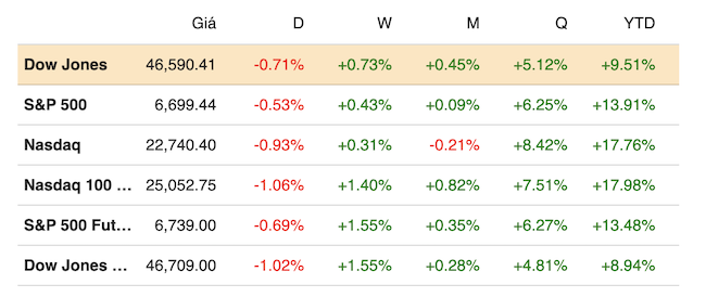 Kết thúc phiên giao dịch ngày 22/10, chỉ số Dow Jones rớt 334.33 điểm (tương đương 0.71%) xuống 46,590.41 điểm. Chỉ số S&P 500 mất 0.53% còn 6,699.40 điểm. Chỉ số Nasdaq Composite lùi 0.93% xuống 22,740.40 điểm. Tại mức đáy trong phiên, Dow Jones đã giảm hơn 400 điểm (tương đương 1%), còn S&P 500 và Nasdaq Composite lần lượt giảm 1.2% và 1.9%.