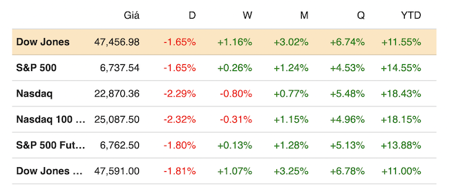 Kết thúc phiên giao dịch ngày 13/11, chỉ số Dow Jones rớt 797.60 điểm (tương đương 1.65%) xuống 47,457.22 điểm, thấp hơn nhiều so với mức cao kỷ lục đã đạt được trong phiên trước đó. Chỉ số S&P 500 lùi 1.66% xuống 6,737.49 điểm. Chỉ số này chứng kiến mức giảm mạnh trong lĩnh vực dịch vụ truyền thông, dẫn đầu là cổ phiếu Disney sụt gần 8% do kết quả kinh doanh quý 4 trái chiều, cũng như lĩnh vực công nghệ thông tin. Chỉ số Nasdaq Composite mất 2.29% còn 22,870.36 điểm. Cả 3 chỉ số chính, cũng như chỉ số vốn hoá nhỏ Russell 2000, đều ghi nhận phiên tồi tệ nhất kể từ ngày 10/10.