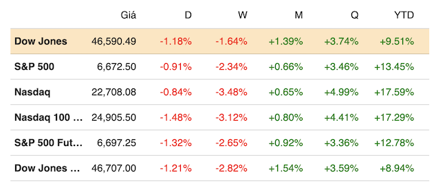 Kết thúc phiên giao dịch ngày 17/11, chỉ số Dow Jones rớt 557.24 điểm (tương đương 1.18%) xuống 46,590.24 điểm, do sự sụt giảm của cổ phiếu Nvidia cùng với cổ phiếu Salesforce và Apple, đã khiến chỉ số Dow Jones chìm trong sắc đỏ. Chỉ số S&P 500 lùi 0.92% xuống 6,672.41 điểm, cỏn chỉ số Nasdaq Composite mất 0.84% còn 22,708.07 điểm.
