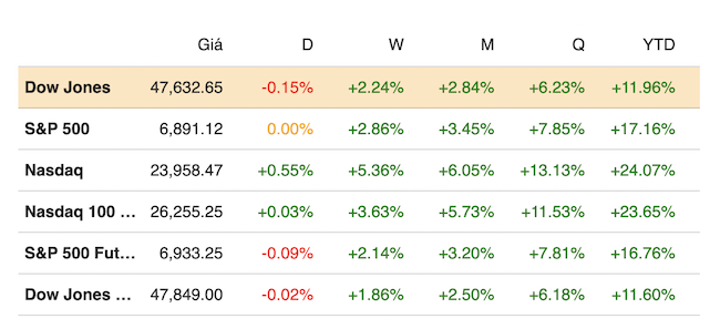 Kết thúc phiên giao dịch ngày 29/10, chỉ số Dow Jones lùi 74.37 điểm (tương đương 0.2%) xuống 47,632.00 điểm, còn chỉ số S&P 500 khép phiên chỉ mất vài điểm còn 6,890.59 điểm. Trong khi, chỉ số Nasdaq Composite tiến 0.55% lên mức đóng cửa cao kỷ lục mới 23,958.47 điểm, được hỗ trợ bởi đà tăng của cổ phiếu Nvidia. Dow Jones đã tăng tới 334 điểm, có thời điểm ghi nhận mức cao mọi thời đại mới trước khi quay đẩu giảm điểm.