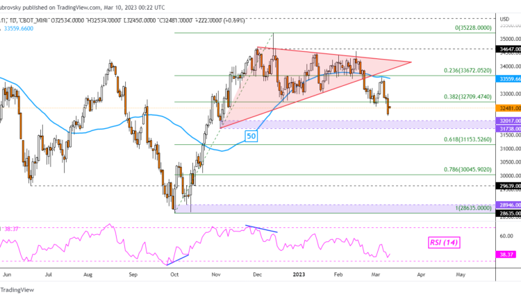 On the daily chart, the Dow Jones broke under the 38.2% Fibonacci retracement level at 32709, further pushing below a Symmetrical Triangle chart formation. This is now placing the focus on the 31738 – 32017 support zone. Meanwhile, the 50-day Simple Moving Average (SMA) continues to guide prices lower, offering a key point of resistance in the event of a turn higher.