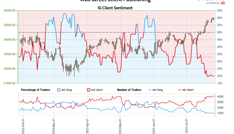 Equities were left relatively unscathed following this month’s Federal Reserve interest rate hike. A pause is mostly priced in for September, beyond that policymakers have stressed a data-dependent approach. In response, retail traders have increased downside exposure in the Dow Jones and S&P 500. This can be seen by looking at IG Client Sentiment (IGCS). IGCS tends to behave as a contrarian indicator. With that in mind, could equities continue higher from here?