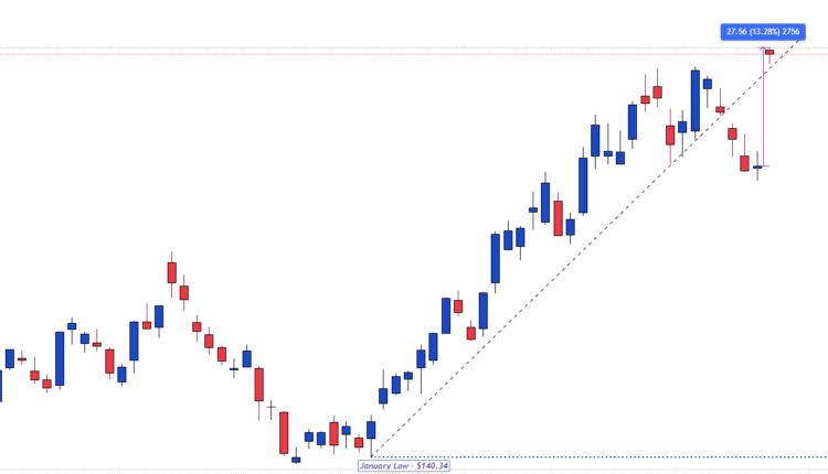 For Nvidia, the upside surprise in Q4 2022 earnings and an increase in the revenue outlook from AI (artificial intelligence) technology has seen the stock rose approximately 13% until reaching a high of $235. As NVDA pulls back to the mid-February high around $230.00, a rebound in gaming has provided an additional boost for profits.