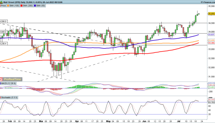 The index surged to a new high for the year on Wednesday, as earnings continued to support the bullish view. Having enjoyed a strong performance over the past week, some consolidation might not be surprising, perhaps even seeing the index head back to retest 34,500 while leaving the breakout intact.