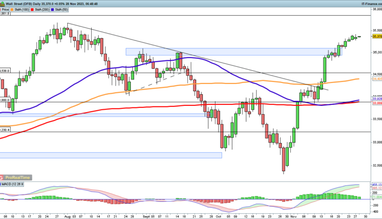 The rally has slowed in recent days, though sellers have been unable to establish control even in the short-term timeframes.Further gains continue to target the summer 2023 highs above 35,600, while beyond this the 2022 peaks at 35,860 become the next target.