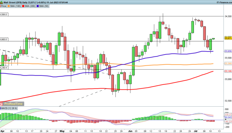 The index rallied off the 50-day SMA on Monday, repeating a bounce from late June from around the 33,650 area. This has helped to stem the bearish case for now, and now the bulls will want to see additional gains above 34,000 that might put the index on course for a fresh attempt to clear the 34,500 area that blocked upside progress over the last month.
