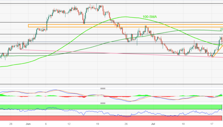 - Overbought RSI also favored sellers but 100-SMA, rising trend line from Monday prod bears.