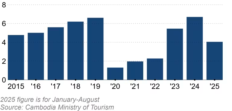 Vương quốc Đông Nam Á này đã đón 6.7 triệu du khách nước ngoài vào năm ngoái, tăng đáng kể so với 4.7 triệu vào năm 2015, và đặt kỳ vọng chào đón 7.5 triệu lượt khách trong năm nay. Thế nhưng, thực tế lại hoàn toàn trái ngược. Trong 8 tháng đầu năm 2025, lượng du khách quốc tế chỉ đạt 4.05 triệu, giảm 5.6% so với cùng kỳ năm trước. Đặc biệt, lượng khách đến trong tháng 8 – ngay sau các cuộc xung đột với Thái Lan – đã sụt giảm mạnh 38.4% so với cùng kỳ năm trước.