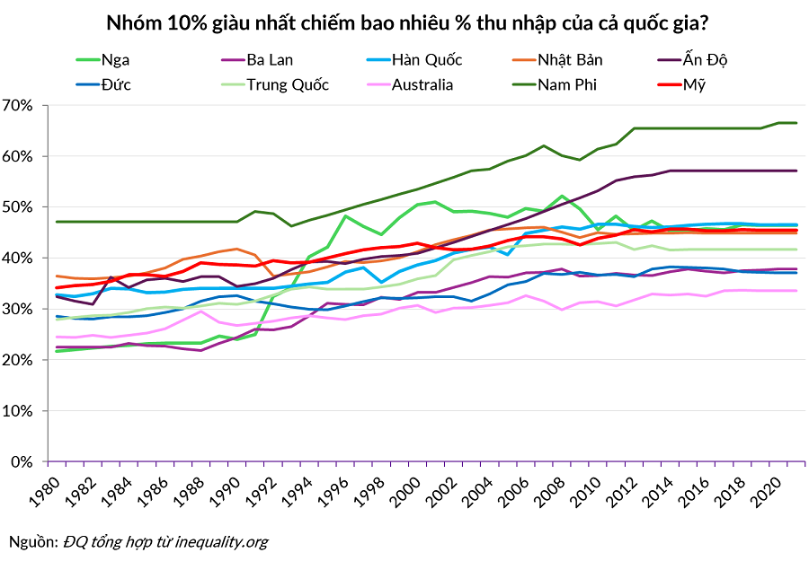 Tỷ lệ thu nhập của nhóm 10% giàu nhất tăng mạnh trong giai đoạn 1980-2021